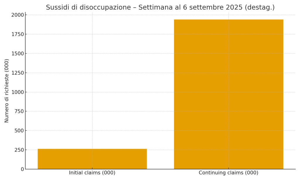 Sussidi di disoccupazione. Nella settimana chiusa il 6 settembre le initial claims sono balzate a 263.000 (+27k, destagionalizzato), massimo dal 2021; le continuing claims sono rimaste attorno a 1,939 milioni (settimana al 30/8).