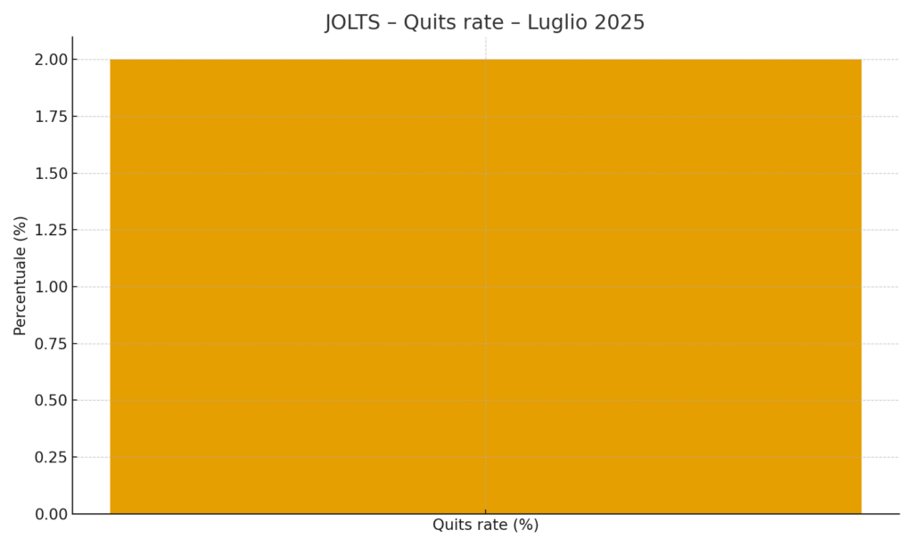 Domanda di lavoro (JOLTS, luglio). Le offerte di lavoro sono rimaste pressoché invariate a 7,2 milioni (tasso 4,3%); il quits rate è stabile al 2,0%: segnali coerenti con una domanda che si normalizza, non crolla. Bureau of Labor Statistics