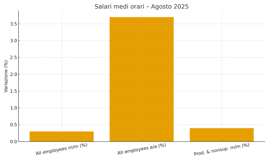 3. Salari (AHE). Agosto ha mostrato +0,3% m/m, +3,7% a/a: leggere ≤0,3% m/m e ~3½–3¾% a/a come coerenza con pressioni inflattive in raffreddamento. Bureau of Labor Statistics