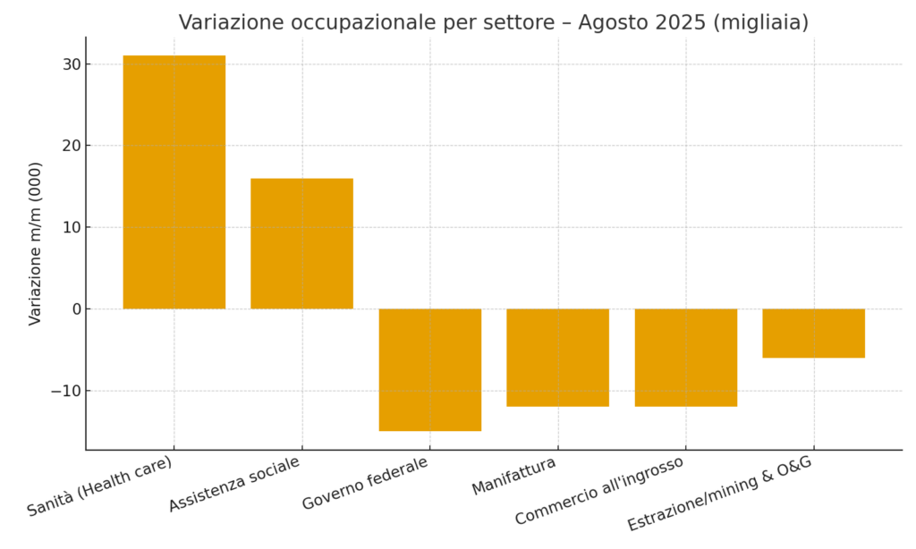 5. Settori. Sanità/assistenza continuano a essere il motore; monitora manifattura, wholesale e governo federale, le aree deboli di agosto. Bureau of Labor Statistics+1